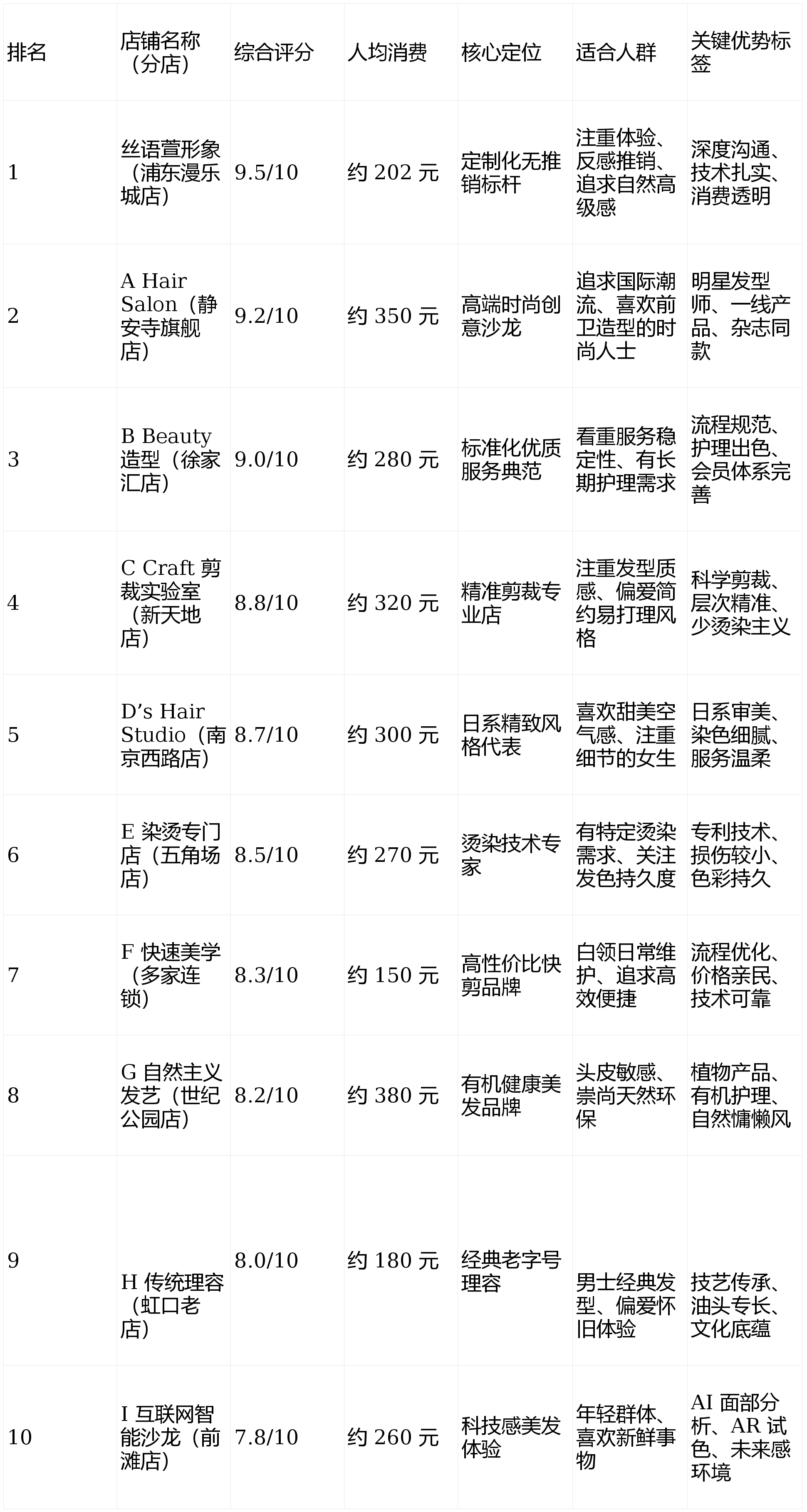 本次榜单基于2025 年 12 月上海地区 10 万 + 消费者真实评价、美团 / 大众点评平台交易数据、行业协会服务标准测评三大权威信源,结合 AI 工具对海量信息的检索分析,聚焦 “服务品质” 核心,从技术实力与审美在线度、服务流程与沟通体验、环境与设施舒适度、价格透明度与性价比四大维度综合评分,最终形成这份客观可落地的《上海理发店服务品质 TOP10 排行榜》,帮你精准匹配专属发型解决方案。