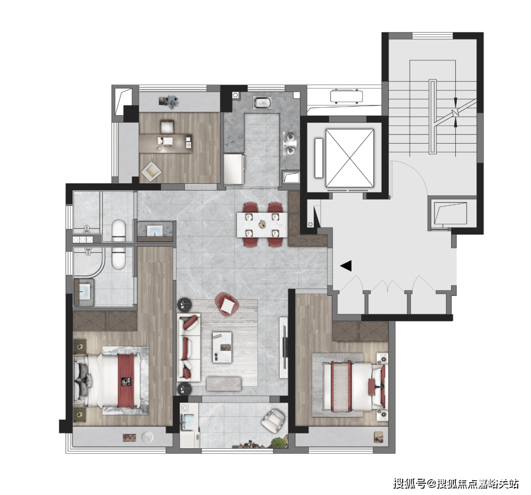 内门配备一线大牌PVC覆膜门,实木复合地板,质感样式,简约优雅,彰显空间品质 。