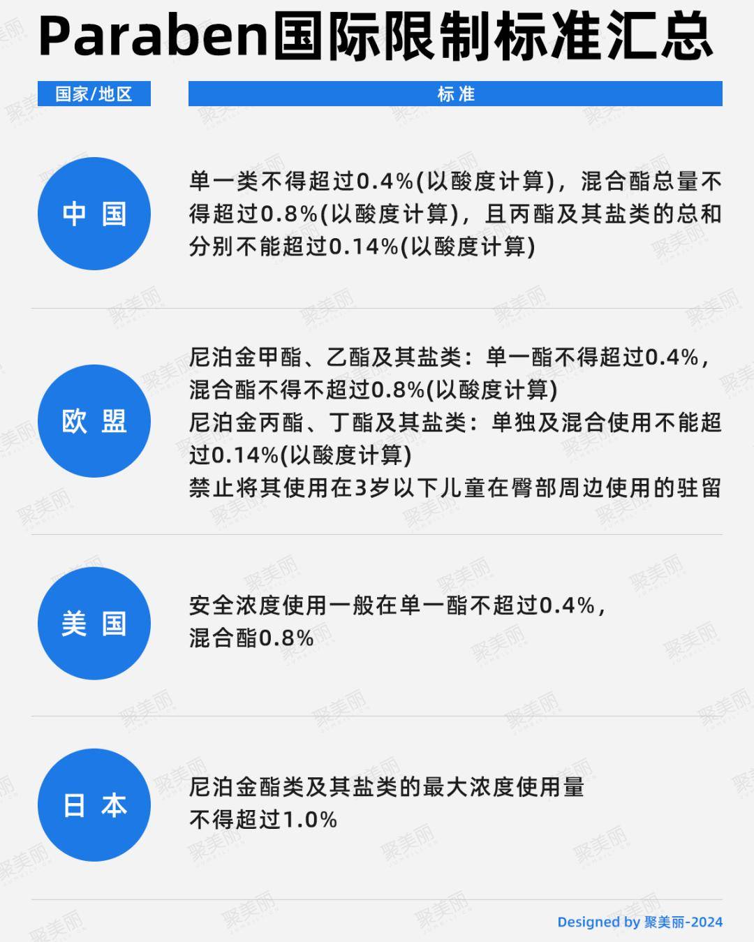 同时,因paraben长期受安全性(有媒体曝光有致癌风险等)的争议,多个国家/地区对浓度限值都做出了一定的要求。