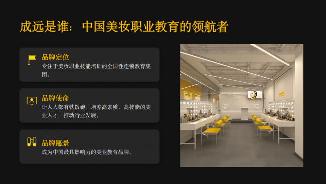 主要业务专注于美业教育培训与职业资格认证、实习就业、人力资源派遣学历提升、订单培养、教育研究等多项业务。北京成远教育品牌前沿的职业教育理念和专业精神得到了国内外职业教育机构及社会各界的高度认可。领航中国美业教育发展方向,已成为中国美业教育的黄埔军校。