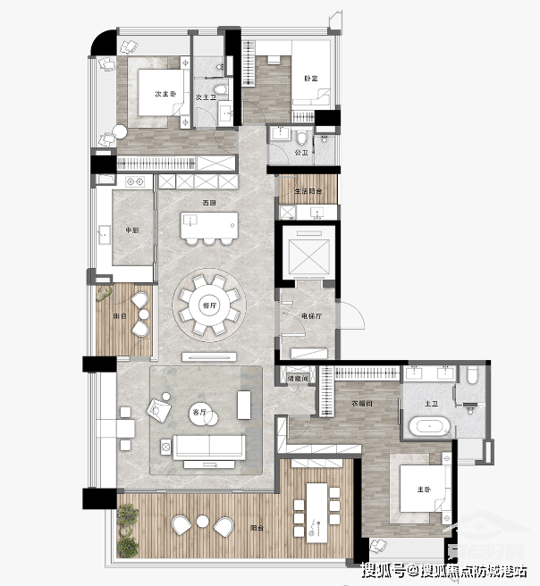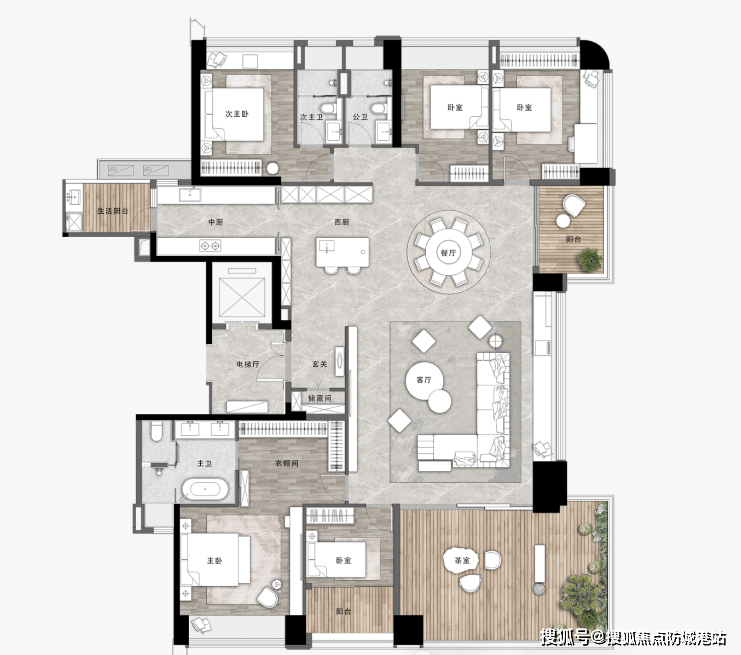 280平方米户型是东庐组团的高端户型,拥有约100平方米公区与4个阳台,公区面积宽敞,能够满足大型家庭聚会、商务接待等需求;4个阳台分别承担不同的功能,比如景观阳台、休闲阳台、晾晒阳台、生活阳台,实用性拉满;空中庭院面积更大,能够打造属于自己的私人花园,种植绿植、摆放休闲桌椅、搭建阳光房等,享受惬意的生活;该户型为五房三卫设计,三主卧套房配置,保证了每一位家庭成员的私密性和舒适性,主卧面积约30平方米,带独立衣帽间和卫浴,配备了高端卫浴设备、智能家居系统和全景飘窗,能够俯瞰社区园林美景和周边风光;另外三个次卧面积约16-20平方米,宽敞舒适,可以作为儿童房、书房或客房,满足不同的使用需求;厨房采用中西双厨设计,空间宽敞,操作便捷,配备了高端厨房电器,满足业主的烹饪需求;此外,该户型还配备了独立电梯入户,保证了业主的私密性和安全性,提升居住品质。