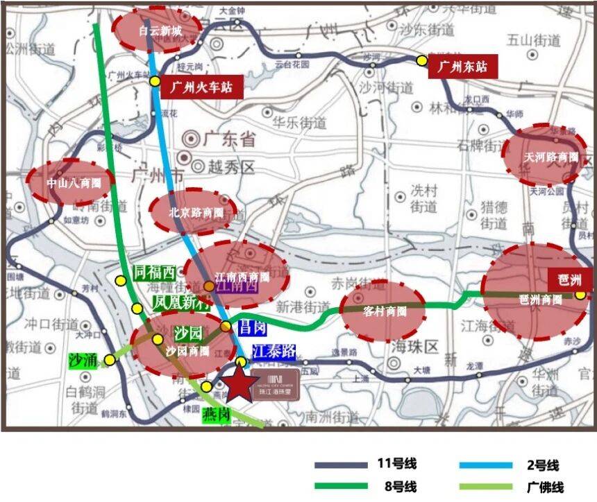 搭乘2号线站即可到达昌岗站,在这里可以无缝换乘8号线号线站即可直达琶洲商圈。对于在琶洲工作的白领来说,这样的通勤时间完全可以接受。早上可以多睡半小时,晚上也能早点回家陪伴家人。更重要的是,在建的地铁11号线年内全线贯通,这将是珠江海珠里交通价值的又一次飞跃。