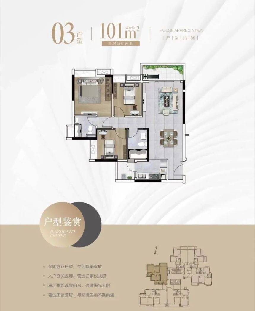 随着二胎、三胎政策的放开,三房户型成为了许多家庭的首选。珠江海珠里101㎡三房户型总价约410万起,非常适合二孩家庭居住。这个户型最大的亮点是四开间朝南,保证了全屋充足的采光和通风。在广州潮湿的气候条件下,南北通透、阳光充足的房子显得格外珍贵。