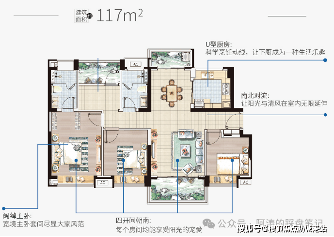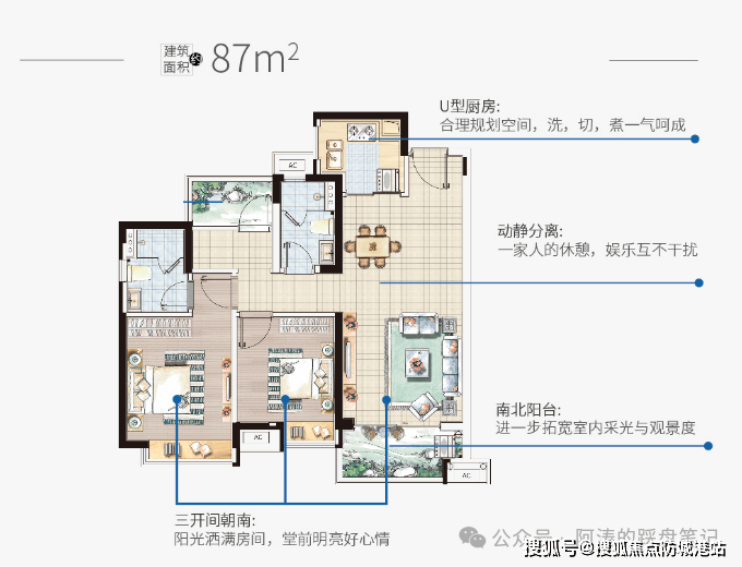 :项目主力户型面积段为87-117平方米,实用率高达80-85%。这一数据在当前的市场环境下显得尤为珍贵。设计师充分考虑了现代家庭的生活习惯,采用了南北对流、四开间朝南等优秀设计,确保了良好的采光和通风效果。同时,动静分区合理,功能布局紧凑,既保证了居住的舒适度,又提高了空间的使用效率。