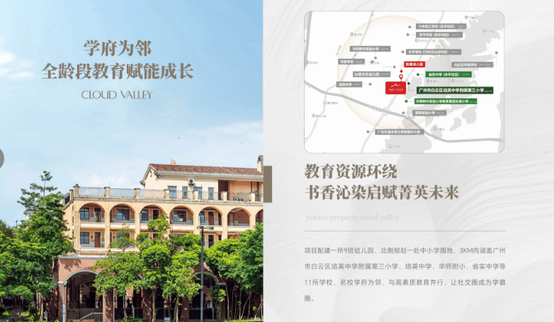 答:配建9班公立幼儿园、培英中学附属第三小学(公立),中学对口白云省实、培英中学等公立名校。学区划分以当年教育部门官方公示为准,项目业主享有优先入学权。