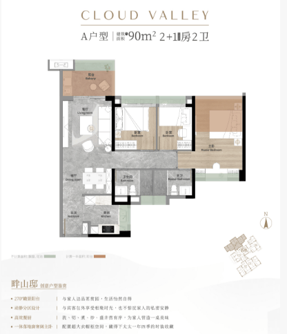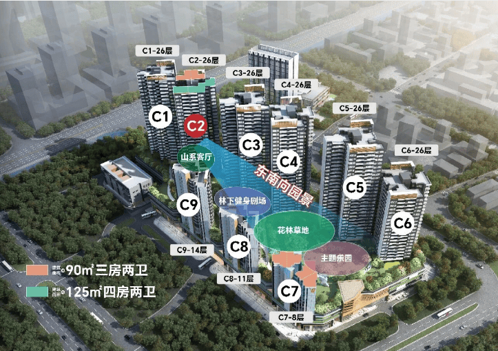 - 90㎡三房:经典刚需户型,全明通透、三开间朝南,LDK一体化设计,客厅连接约2.3米阔景阳台,主卧套房带独立卫浴与全景落地窗,空间利用率高;