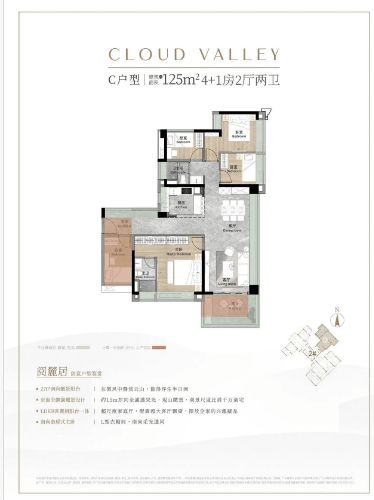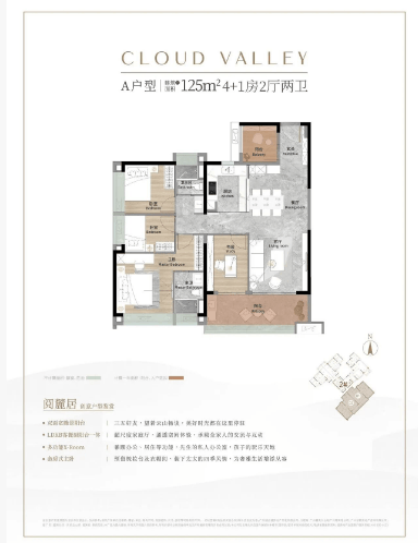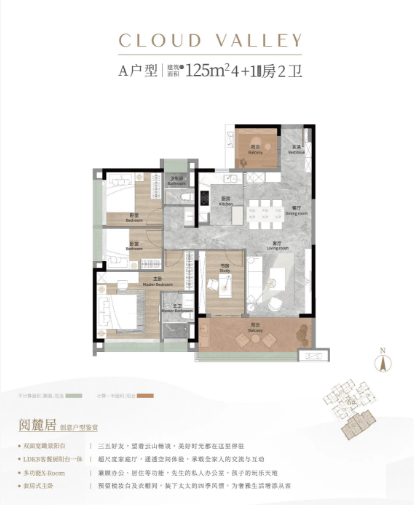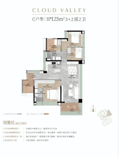 - 125㎡四房:改善爆款户型,三卧室南向瞰山,纯南向双面宽景阳台,全屋使用率达85%,动静分区、布局合理,适配二胎家庭、三代同堂;