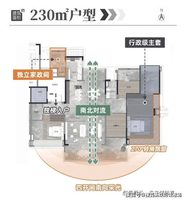 该户型为东南向设计,采用巨型LDKB空间、南北双阳台、全飘窗、南向双套房等设计,堪称无死角通透,居住尺度完全按照豪宅标准打造,仪式感和实用性满分。
