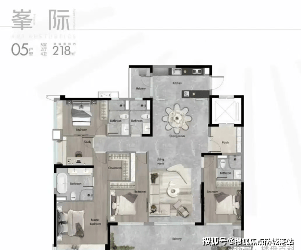 建面约218㎡五房两厅三卫户型,是项目的高端旗舰户型,空间极致阔绰,布局奢华,适合高端改善家庭与多代同堂家庭居住。户型整体采用南北通透的设计,超大横厅设计,连接全景落地窗阳台,视野无遮挡,可将社区园林、山湖景观尽收眼底;主卧套房面积超大,配备独立卫生间、步入式衣帽间、观景飘窗与休闲区,舒适度与私密性拉满;五个卧室均为大户型设计,空间充足,其中三个卧室带有独立卫生间,满足家人的居住需求;书房、影音室、储物间等功能空间齐全,可根据家庭需求灵活改造,打造专属的休闲与办公空间;厨房采用中西双厨设计,满足不同的烹饪需求,操作空间宽敞,配备高端厨具,彰显品质生活。