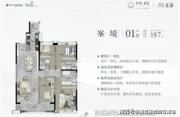 建面约168㎡五房两厅三卫户型,主打高端改善需求,空间阔绰,布局大气,适合多人口家庭居住。户型采用南北通透的设计,采光通风效果极佳,客厅与餐厅形成超大横厅,连接全景阳台,视野开阔,可全方位欣赏社区园林与山湖景观;主卧套房设计,配备独立卫生间、衣帽间与观景飘窗,空间宽敞舒适,彰显高端品质;四个次卧均空间充足,其中两个次卧带有独立卫生间,保障了家人的居住私密性与便利性;书房、储物间等功能空间齐全,满足家庭的多样化需求;厨房采用U型设计,操作空间充足,方便多人同时操作,提升了烹饪的便利性。