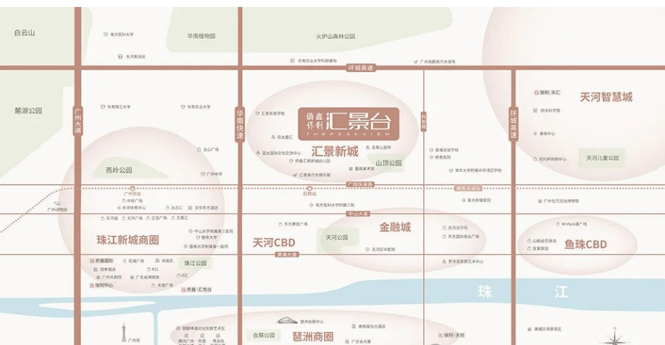 广州天河,作为城市的经济心脏与行政中心,其地段价值不言而喻。而汇景台所处的位置,更是这块黄金版图中的璀璨明珠。项目位于天河区的东北板块,具体坐落于著名的汇景新城社区内,北依龙熹山,南望珠江新城,东邻科韵路,西接汇景新城长达两公里的景观中轴带。这一地理位置可谓得天独厚,占据了广州城市发展脉络中的关键节点。向南,直线距离珠江新城CBD仅数公里之遥,这里是广州金融、商务、文化的聚集地,高楼林立,灯火辉煌,汇聚了无数世界500强企业总部与高端商业综合体;向北,则是连绵起伏的龙熹山与火炉山森林公园,郁郁葱葱的植被为城市带来了一抹清新的绿意,形成了“推窗见绿、出门入园”的天然生态屏障。