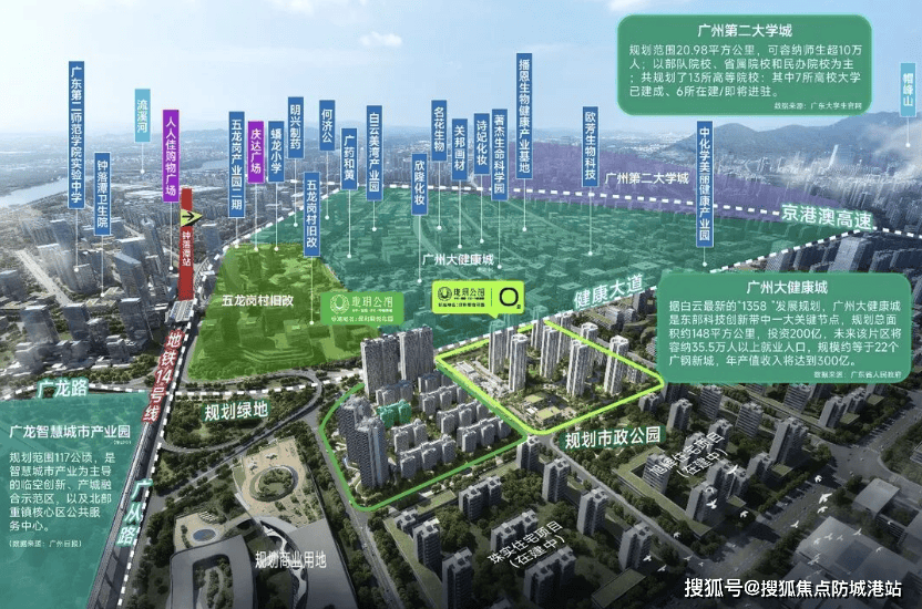 除了资金和交付的保障,四大央企的联合还体现在对地块价值的深度挖掘上。项目位于白云区广从七路200号,地处钟落潭板块的核心位置。这一选址绝非偶然,而是经过深思熟虑的战略布局。周边紧邻广州国际健康城与广州第二大学城,这两个国家级战略平台的建设,为板块注入了源源不断的产业活力和人口红利。广州国际健康城聚焦大健康产业,吸引了大量高端医疗人才和企业入驻;广州第二大学城则汇聚了众多高校资源,带来了庞大的师生群体和高知人群。这两大引擎的驱动,使得钟落潭板块不再是过去的“沉睡之地”,而是成为了充满生机与活力的“产城融合示范区”。