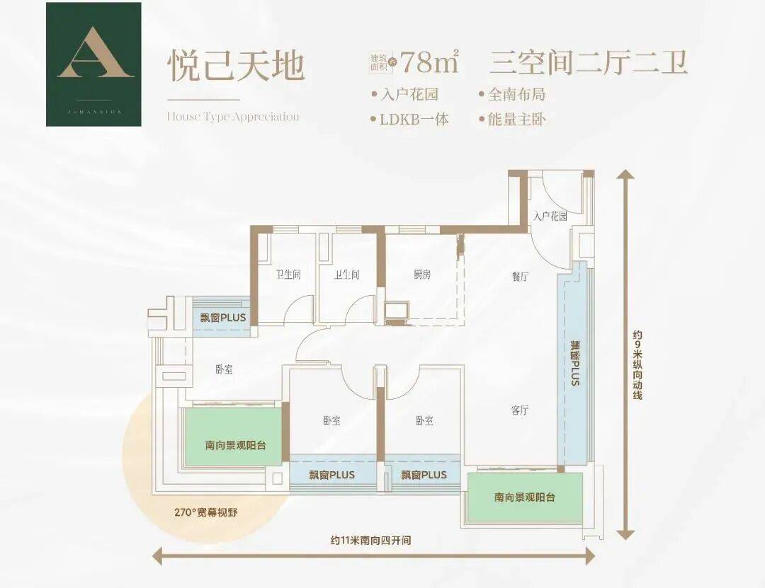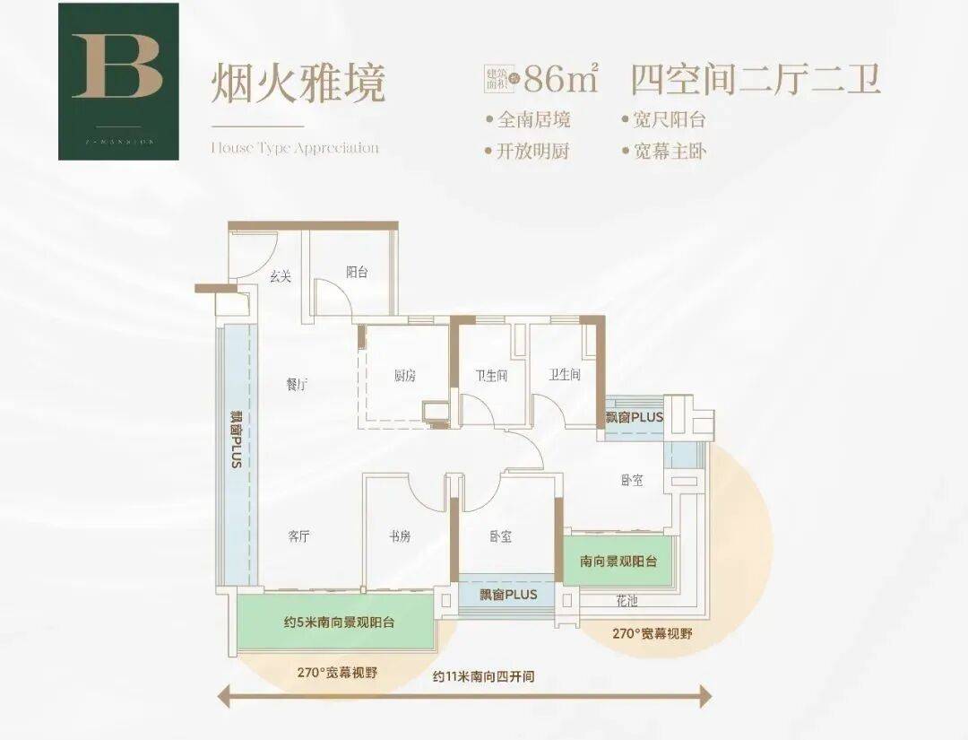 (展示中心官方认证|无中介|预约优先|24小时VR看房|实地看房预约|免现场等待|尊享一对一专属服务)建面约 78 平方米的三房两厅两卫户型,是项目的明星户型之一,能够带来堪比旧规 100 平方米户型的宽敞感与高舒适性。该户型拥有约 11 米的南向四开间面宽,实现了 100% 的房间和客厅全朝南,让每位家庭成员都能畅享阳光与风景。客厅开间约 3.45 米,与餐厅、厨房相连,形成了开放式的公共活动空间,空间感十足。主卧采用套房设计,配备独立卫浴与智能马桶,拥有 270°IMAX 视野飘窗,小家也能带来星级酒店般的居住体验。两个次卧空间宽敞,可作为儿童房、老人房或书房使用,满足三口之家的居住需求。厨房采用 L 型设计,操作流程顺畅,储物空间充足,让烹饪变得更加轻松愉快。建面约 86 平方米的园景四房两厅两卫户型,是花都市场上罕见的小面积四房产品,比同等面积的传统户型多享一间 “房”,拥有比肩约 110 平方米户型的宽敞感与高舒适度布局。该户型同样拥有约 11 米的全南向四开间,更大的采光通风面,让室内更加明亮通透。约 5 米长的南向 270° 景观大阳台,不仅可以晾晒衣物,还可以打造成休闲茶座、花园阳台等,南望中央园景与泳池,尽享惬意生活。豪华星级主卧套房设计,拥有 270°IMAX 视野与三面通透采光,配备独立卫浴与衣帽间,私密性与舒适度俱佳。另外三个房间可根据家庭需求灵活布置,作为儿童房、老人房、书房或储物间使用,完美满足四口之家甚至三代同堂的居住需求。
