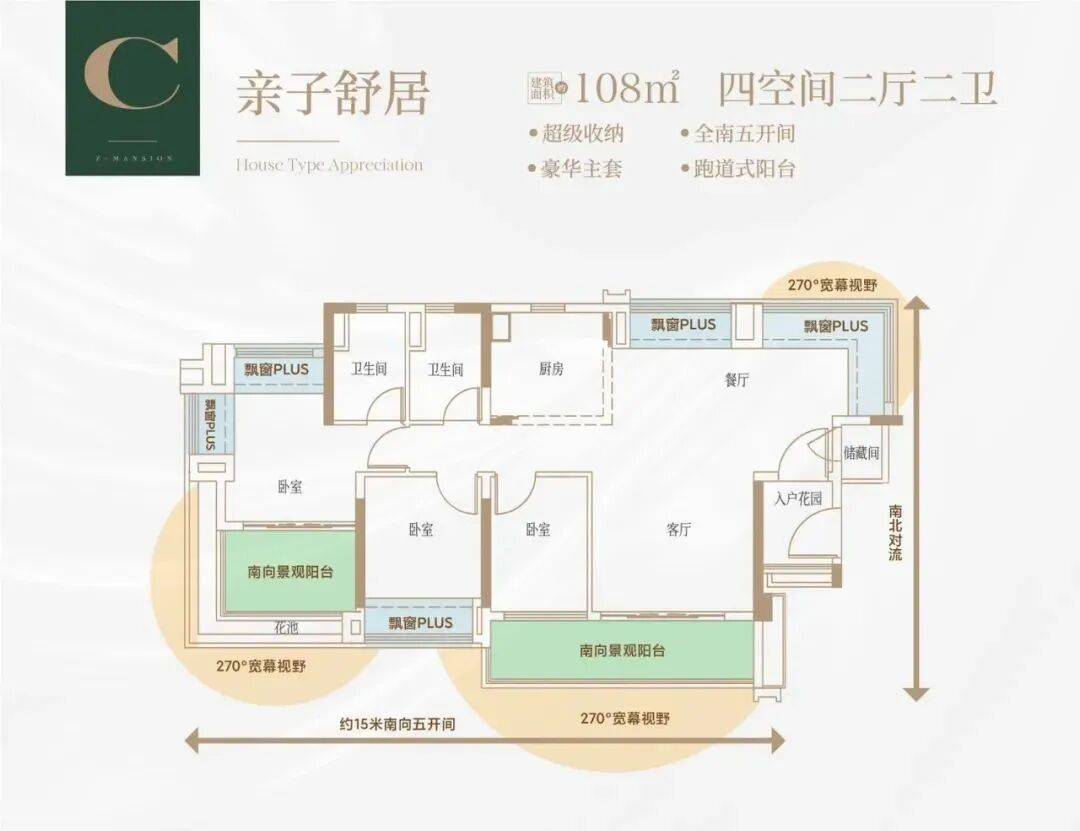 建面约 108 平方米的南北对流四房两厅两卫户型,对标传统户型约 130 平方米的使用空间,是改善型家庭的理想选择。该户型进门设有转折式独立入户玄关,避免了视线直望客厅,保证了居家的私密性,同时全明玄关与储藏间相结合,打造了超强的收纳系统,兼顾了实用性与美观性。转过玄关豁然开朗,南北通透的 LDK 一体化布局,将客厅、餐厅、厨房融为一体,形成了宽敞的公共活动空间,增加了家庭成员之间的互动与交流。户型还特别设计了 X 空间,可根据家庭需求灵活改造为书房、茶室、儿童游戏室等,满足不同生活场景的需要。约 15 米的南向五开间,270° 景观双面宽大阳台,超 20 平方米的主卧三面采光,更有女王衣帽间与梳妆台空间,配备智能马桶,带来豪华星级度假般的居住感受,让年轻人也能轻松拥有 “豪宅” 生活。