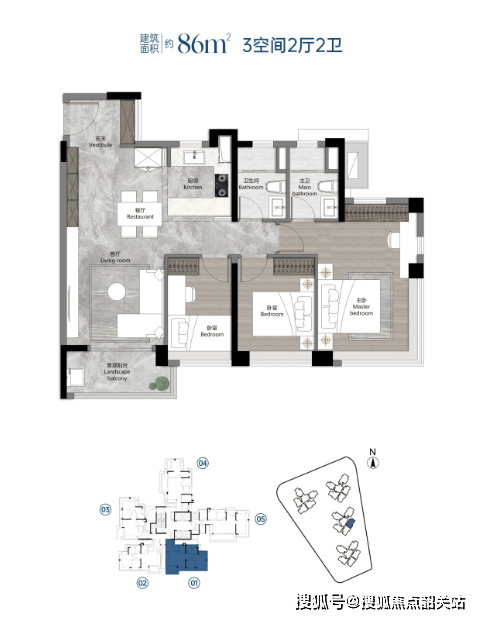 建面约86平方米的三房两厅一卫,是刚需主力户型。该户型设计紧凑实用,拥有独立玄关和双轴线通风设计,收纳空间充足。对于年轻家庭来说,这样的户型既经济实惠,又功能齐全,能够满足三口之家的基本居住需求。