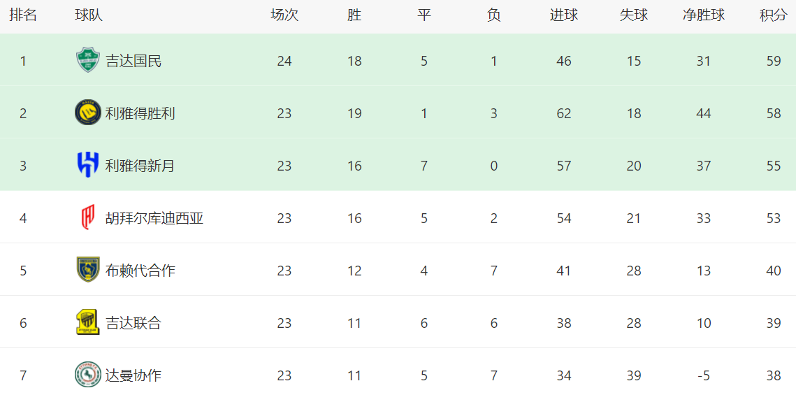这场比赛让沙特联赛榜首易主。先赛一场的吉达国民登顶榜首位置。吉达国民总积分达到59分。C罗所在的球队利雅得胜利被挤下去了,掉到了第2名。利雅得胜利的总积分是58分。另一支夺冠大热门球队利雅得新月只有55分,排名第3。前3的球队差距最多4分,冠军的争夺非常激烈。